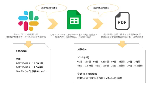 Googleスプレッドシート上では,サポーターごとの勤務の合計時間が自動計算されており,月末に出勤表をPDF形式で自動出力することができます.