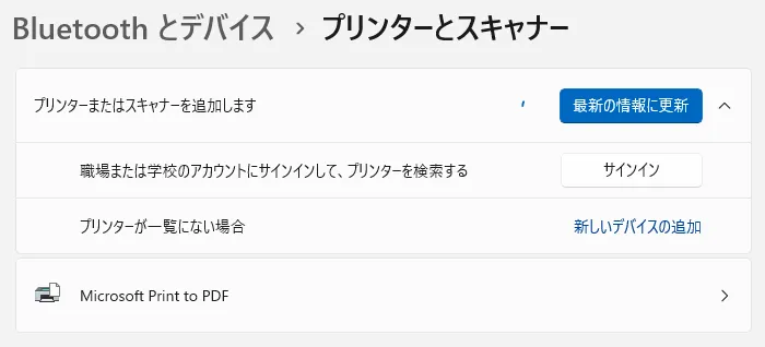 1. スタートメニュー等から「設定」を開き,「Bluetoothとデバイス > プリンターとスキャナー」を開いてください.