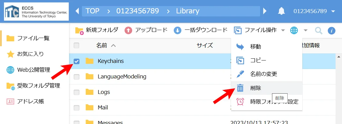 2. WebDAV環境上で,ディレクトリ<共通ID(UTokyo Accountの先頭10桁の数字のみの部分)>/Library/Keychainsを選択し,削除してください.