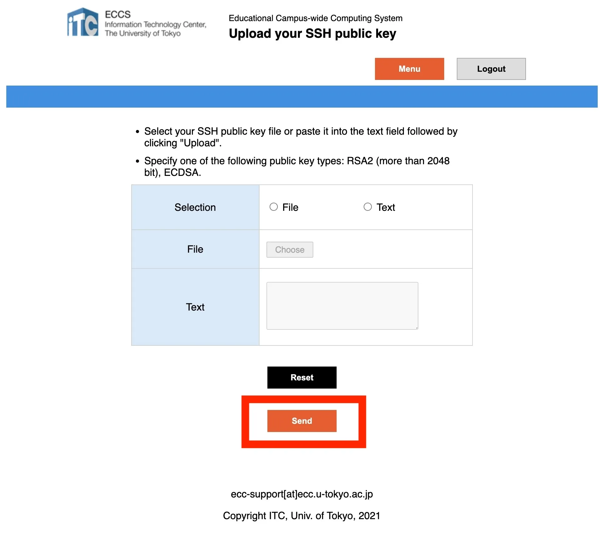 - 公開鍵のファイルをアップロードするか,その内容を貼り付けて,「Send」もしくは「送信」を選択してください.