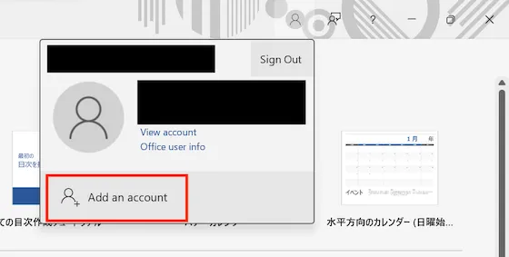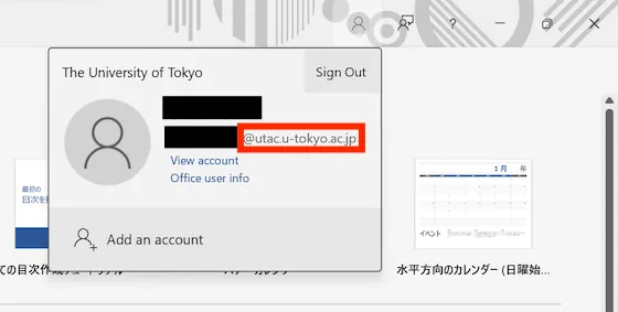 • If the above screen is not displayed and the normal editing screen is displayed You are signed in with a Microsoft account in the Office app. Click the person icon in the upper right and check the account you are currently signed in with. If you are signed in with a different account other than UTokyo Account, select “Add an account.”