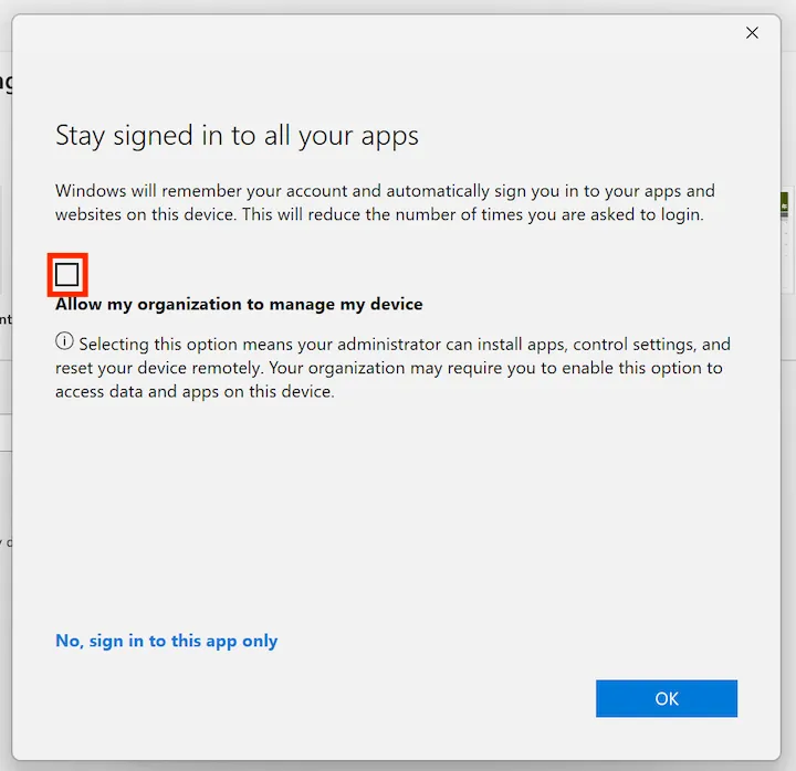 4. If you are using a Windows device, you may see a dialog that says “Stay signed in to all apps.” It has been confirmed that depending on the settings here, an error message may occur while using an Office app. To prevent this, please answer the following questions. Uncheck the box that says “Allow my organization to manage my device.” Next, if you want to automatically sign in to Microsoft systems other than Office apps (such as OneDrive) with your UTokyo Account, select “OK.” If you only want to sign in to Office apps with your UTokyo Account, select “No, sign in to this app only.”
