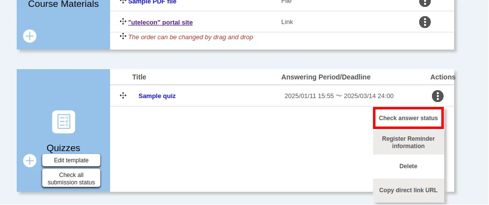 This page explains how to score quizzes created in UTOL and check the submission status for rating and other purposes.