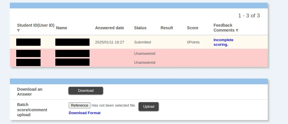 If the file is uploaded successfully, the scores and feedback comments in the Excel file for scoring will be loaded, and the status column for the scored students in the “Answer Status” screen will change to “Marked” or “Entered by the instructor”.