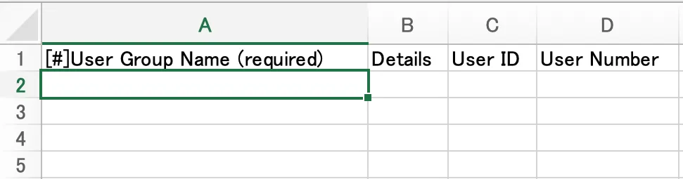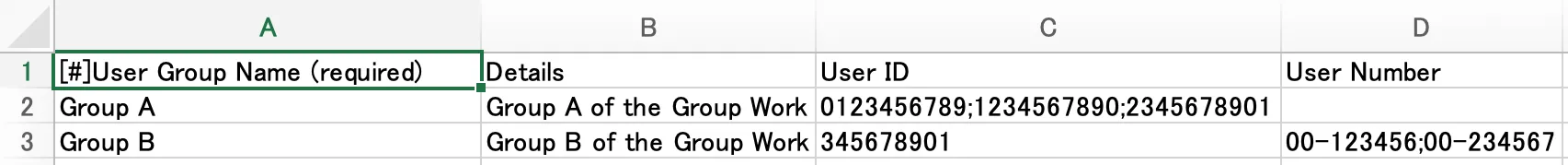 Please follow the procedure below to enter the information for each user group you wish to register. Note that each user group corresponds to a single row in the Excel file. In other words, you cannot use multiple rows to describe a single user group.