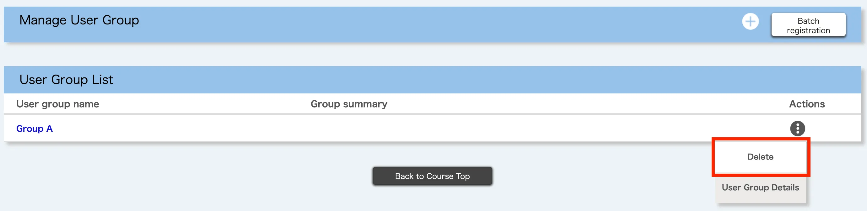 Open the “Actions” menu for the user group you want to delete in the “User Group List” and click on the” Delete” button.