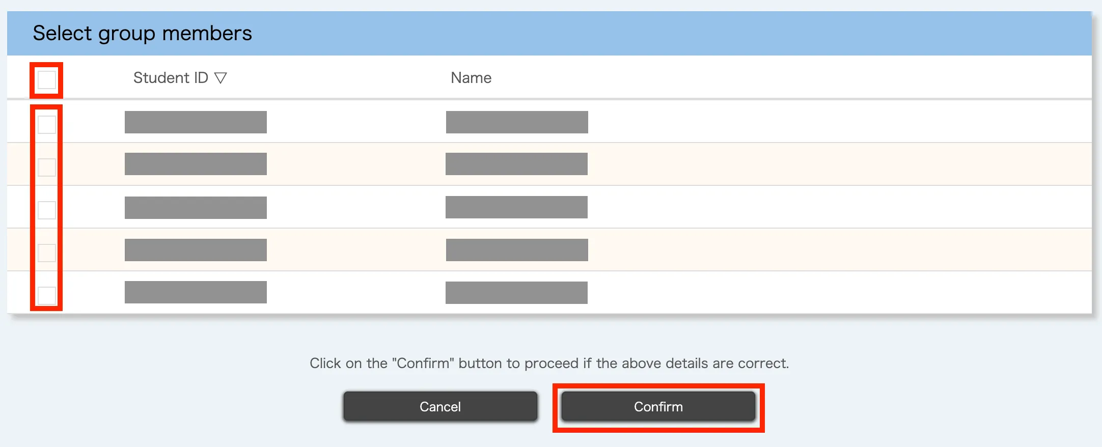 Select all the checkboxes for the users you want to add to the user group and click on the “Confirm” button to proceed. (You can select all the displayed users at once by selecting the checkbox directly “Select group members”.)