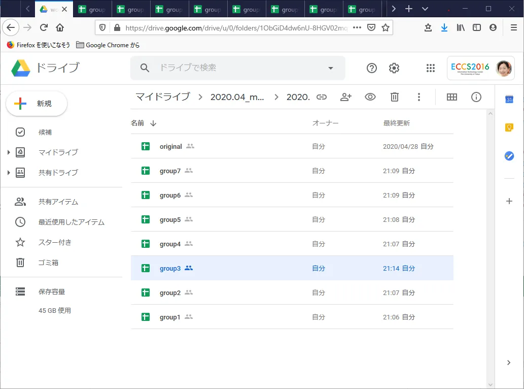 具体的には、事前に Google Slides でワークシートをグループの数だけ、グループ番号をファイル名に付けて用意しました。そして、ブレークアウトルームにわかれたとき、グループ番号と同じ番号のワークシートに対してグループごとに作業してもらいました。