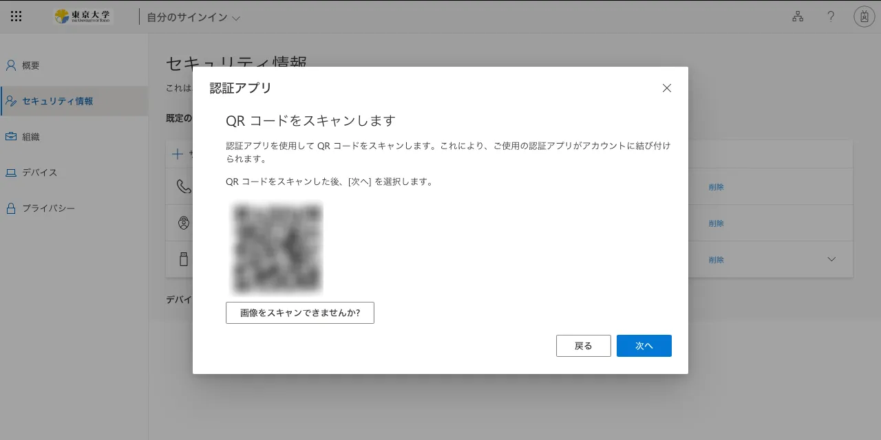 - Yubico Authenticatorアプリにアカウントが追加されたら,QRコードが表示されているブラウザ画面で「次へ」を押してください.