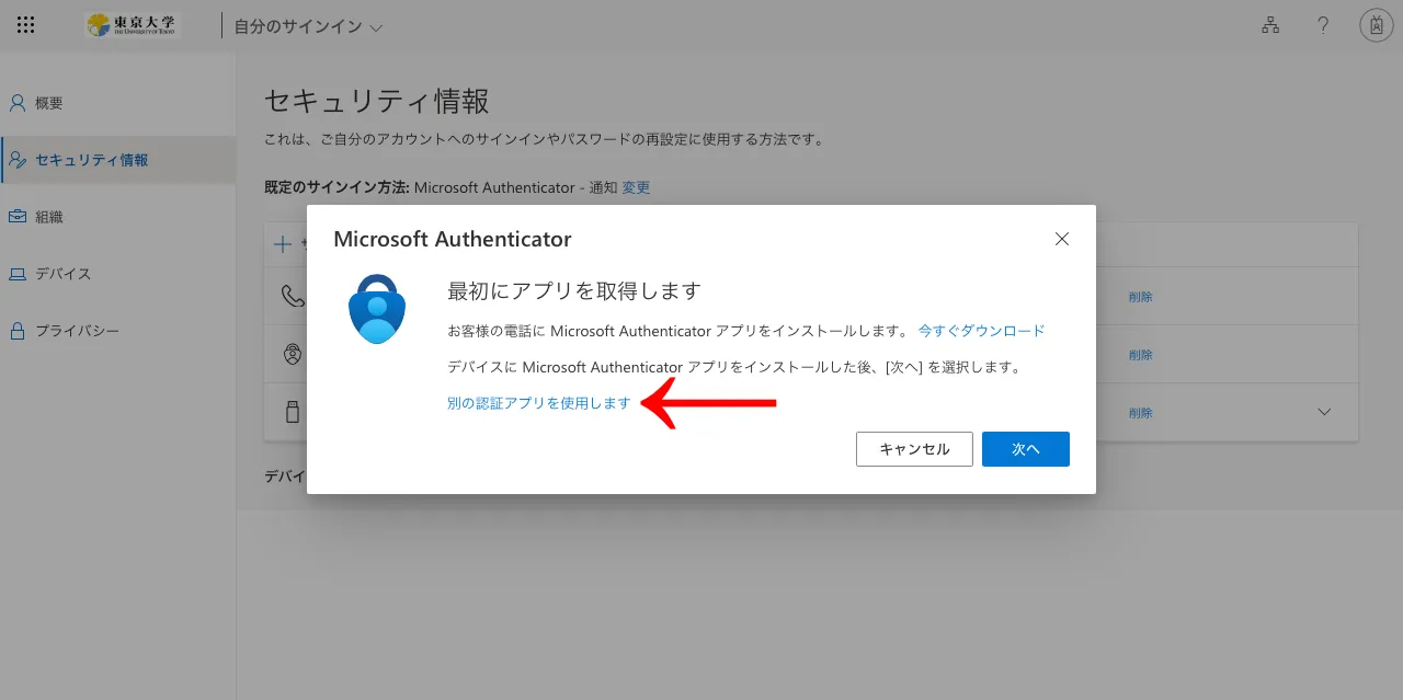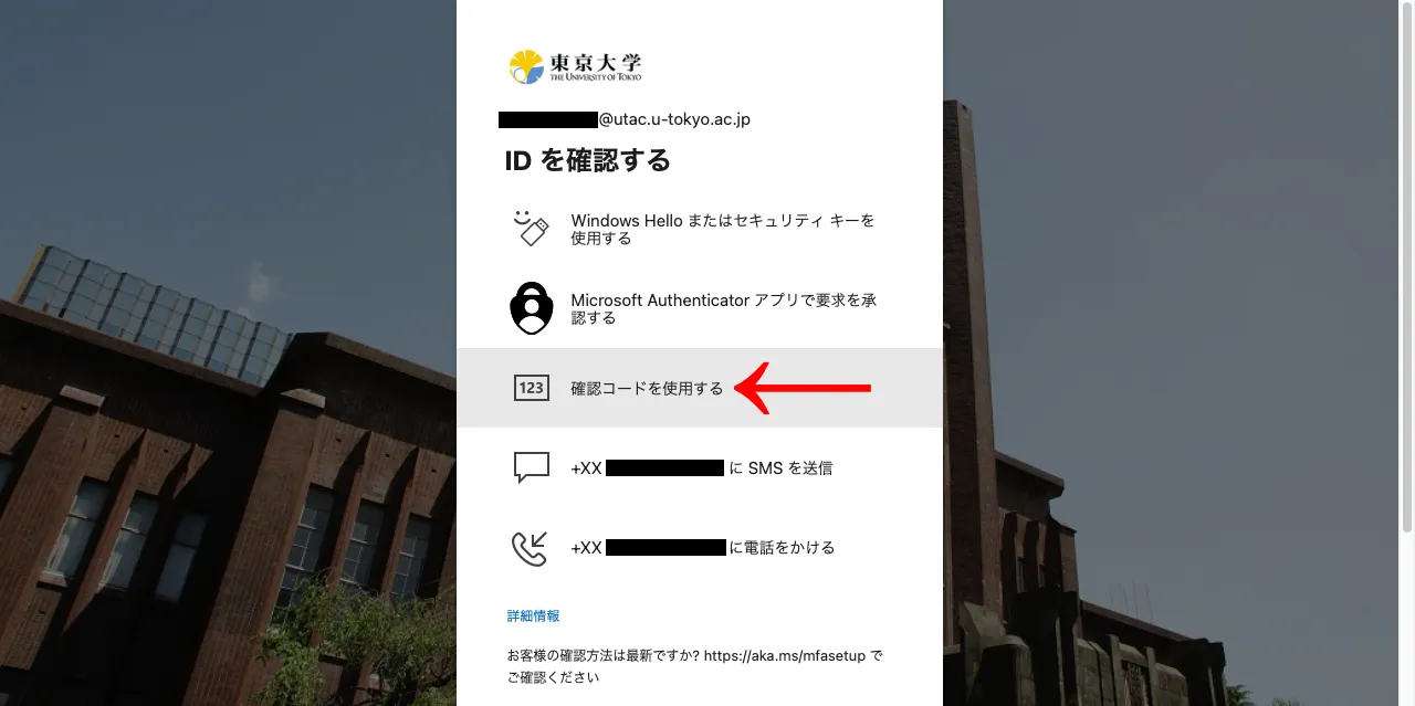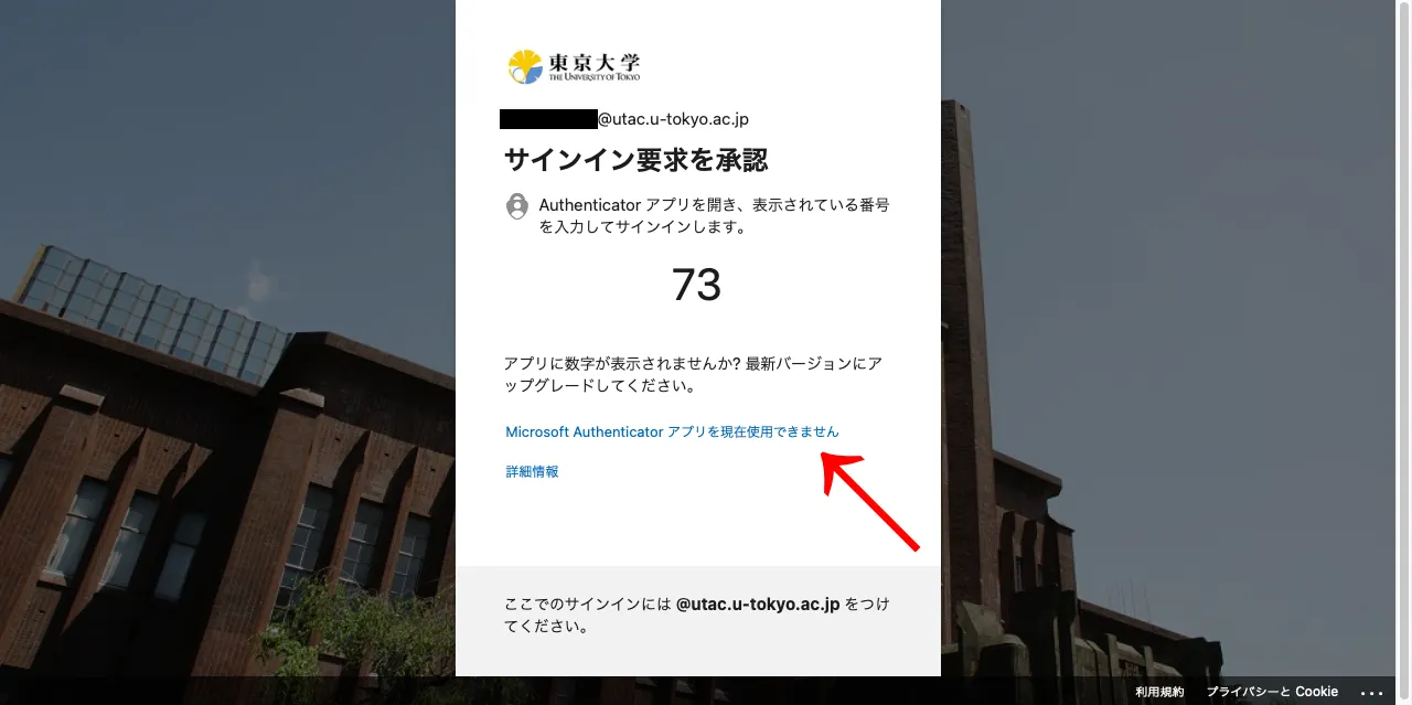 - UTokyo Accountでサインイン時(パスワード入力後)に,デフォルトの本人確認方法で多要素認証の本人確認を行う画面が表示されますが,その画面で「問題がありますか? 別の方法でサインインする」あるいは「Microsoft Authenticator アプリを現在使用できません」というリンクを押してください.