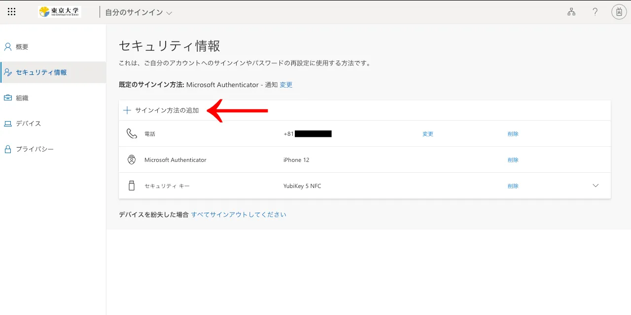 - 多要素認証の設定ページにサインインし,「サインイン方法の追加」を押してください.