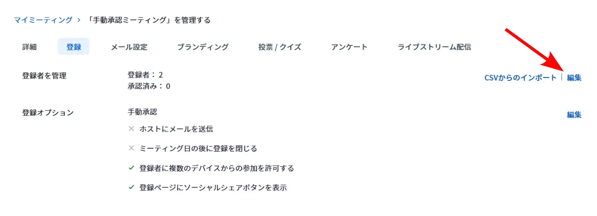 4. 「登録者を管理」欄の右側にある「表示」(手動承認を有効にしている場合は「編集」)ボタンを押してください.
