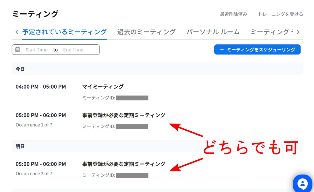 2. 自分のスケジュールしたミーティングが,リストとして表示されます.事前登録機能を有効にしたい定期ミーティングの名前を押してください.どの回の項目を押しても構いません.