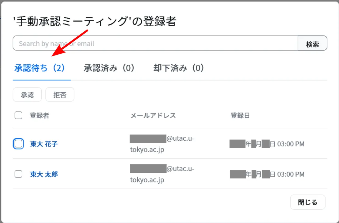 5. 表示される画面の「承認待ち」リストに,登録手続きを済ませた参加希望者の一覧が表示されます.