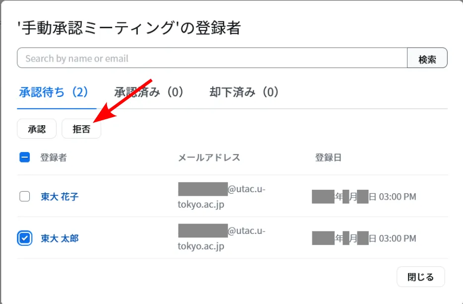 6. 拒否したい参加希望者の左にあるチェックボックスをオンにして,「拒否」ボタンを押してください.