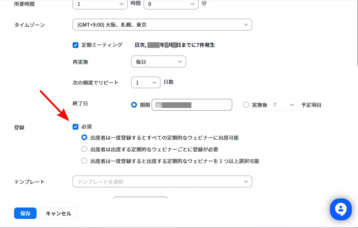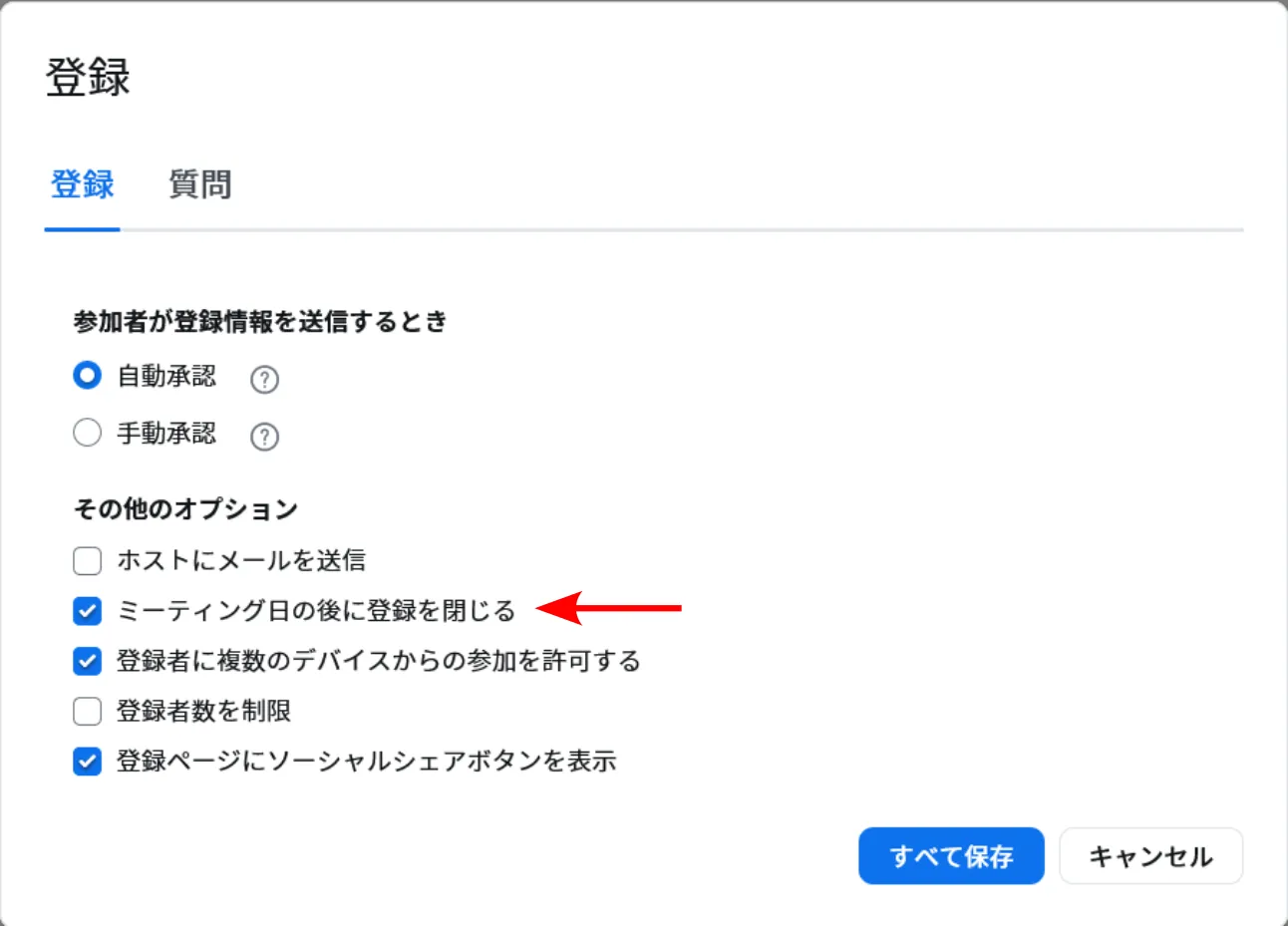 5. 「ミーティング日の後に登録を閉じる」チェックボックスをオンにしてください.