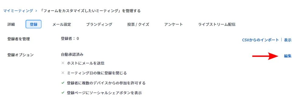 すでに作成されたミーティングで「参加者の登録」機能を有効にする場合(非推奨)