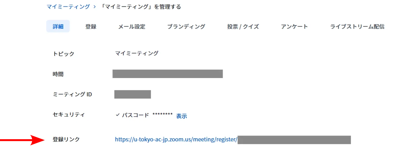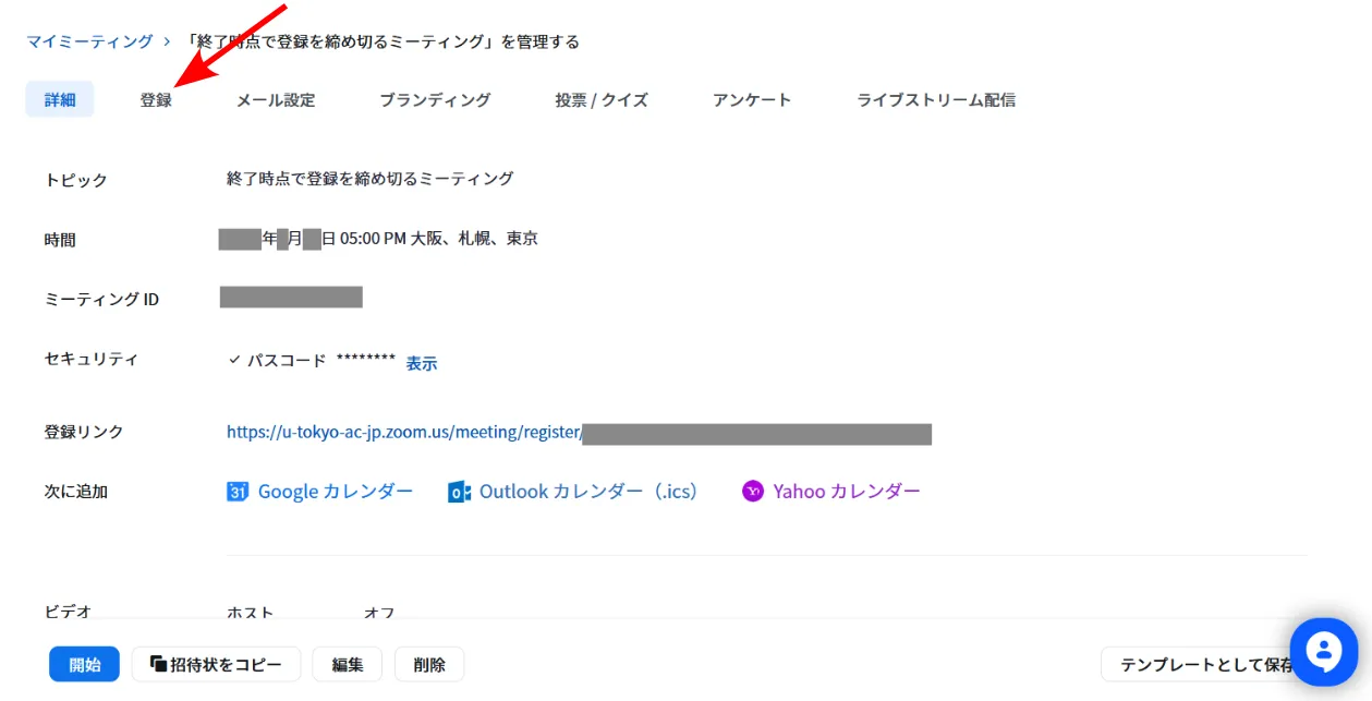 3. ミーティングの情報が表示されます.上の方に「登録」「メール設定」等のタブが並んでいます.「登録」タブを選択してください.
