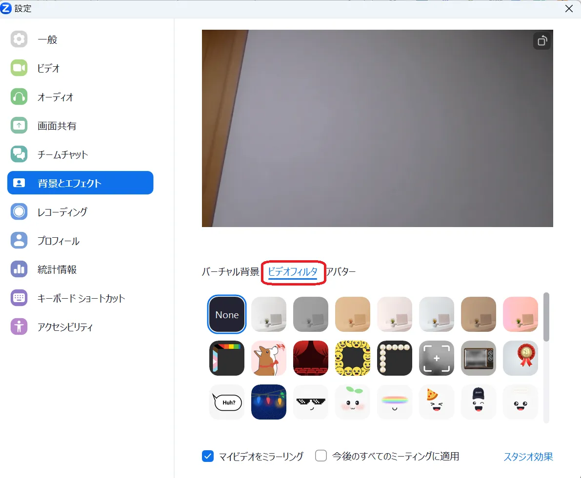 3. 好みのビデオフィルタを選んでください.(ビデオフィルタでは,バーチャル背景と異なり,オリジナルの画像などをアップロードすることはできません.)