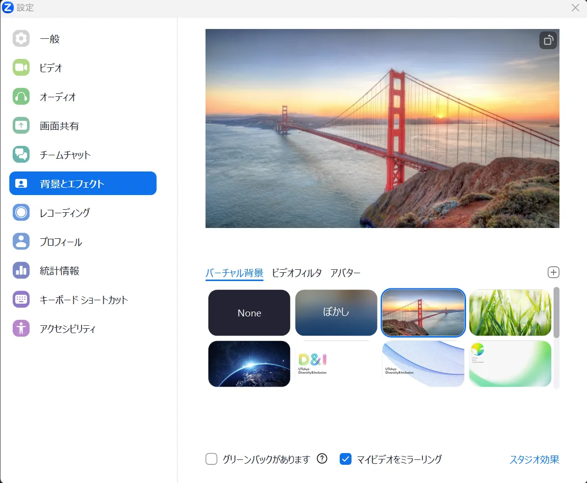 • 設定によっては,映像の左右が反転し,背景画像が鏡文字になってしまうことがあります.必要であれば,設定の「背景とエフェクト」内にある「マイビデオをミラーリング」のチェックボックスのオンオフを切り替えてみてください.